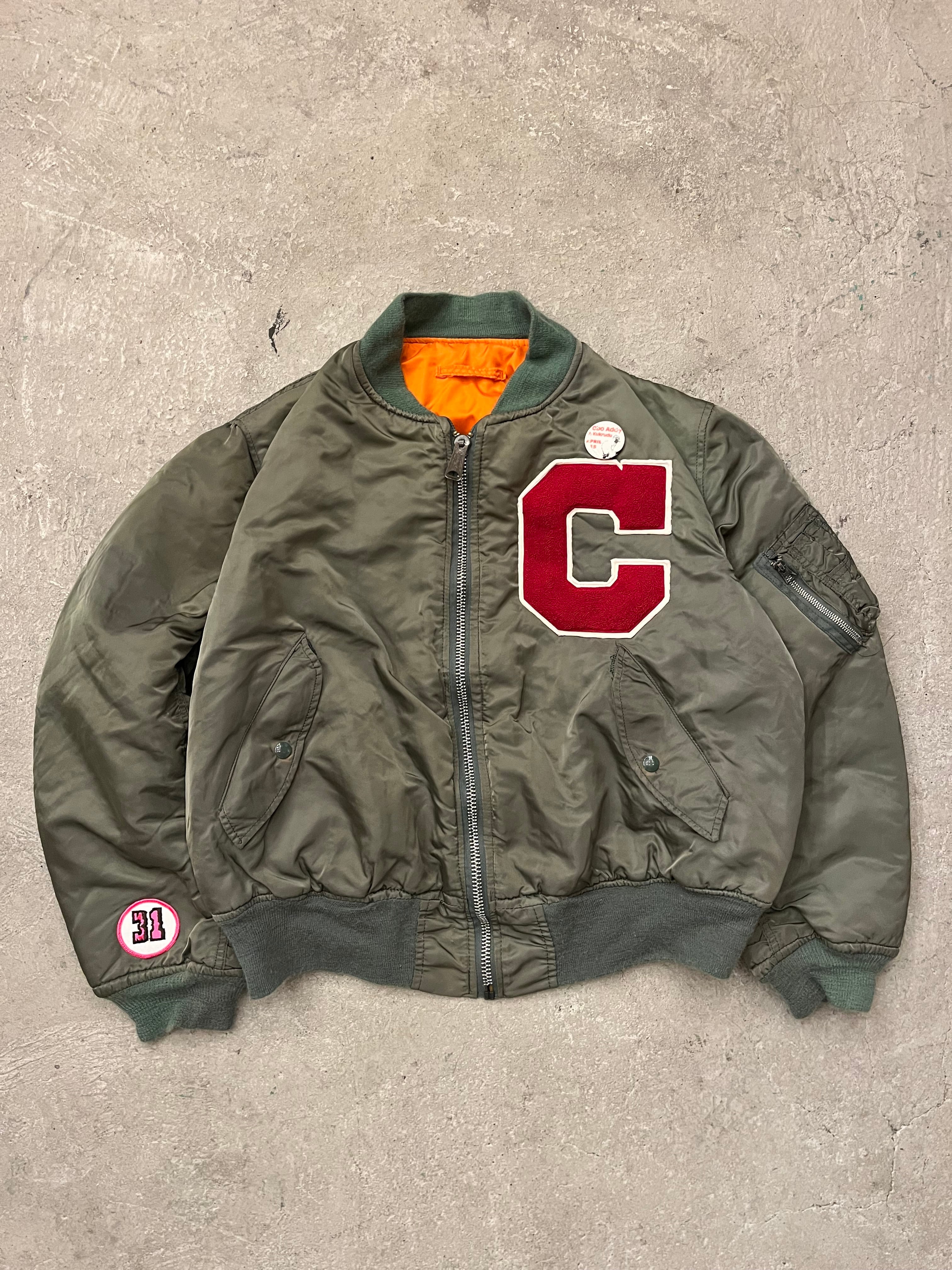 MADE IN USAのMA-1にvintageのシニールパッチと缶バッジでカスタムしました。特にシニールパッチはアメリカでも希少価値が上がってきているアイテムです。