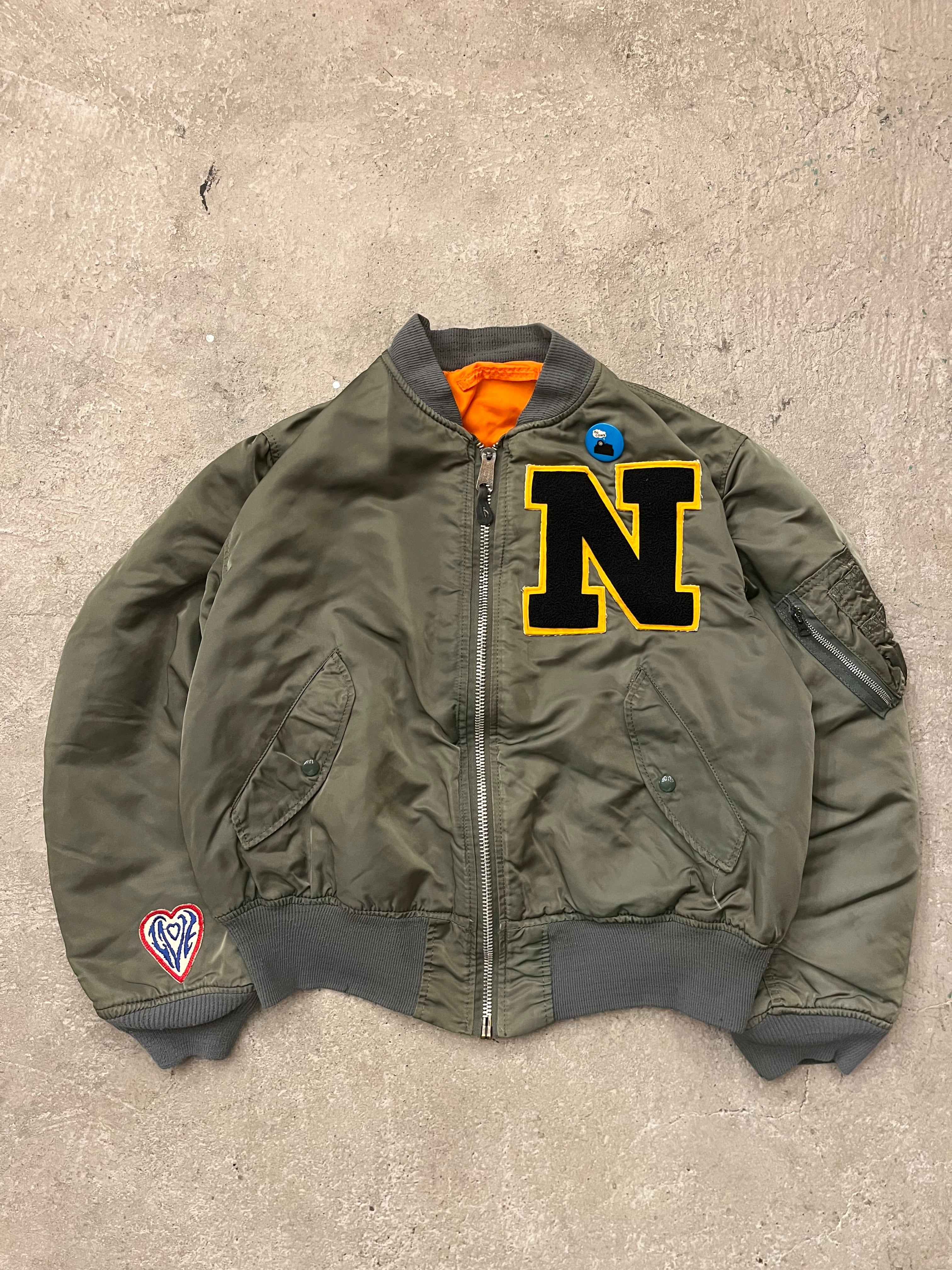 MADE IN USAのMA-1にvintageのシニールパッチと缶バッジでカスタムしました。特にシニールパッチはアメリカでも希少価値が上がってきているアイテムです。