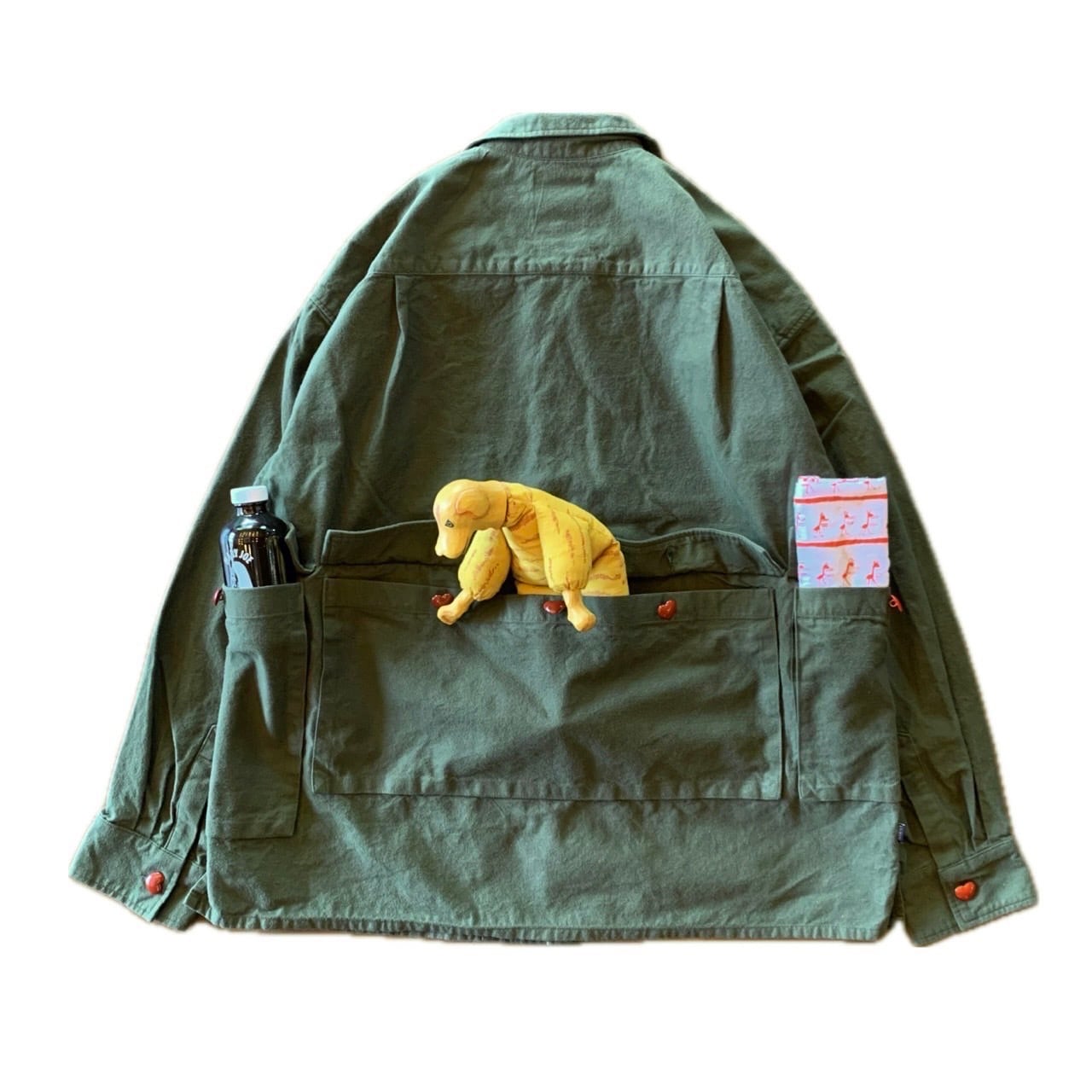 背中の大きなポケットは旅先でのスーベニアやライトアウターをしまう為のもの。